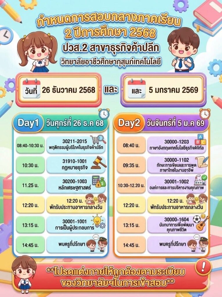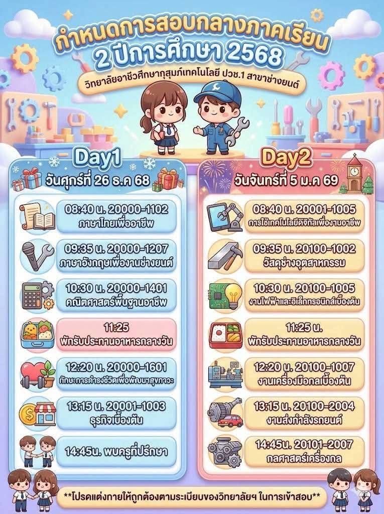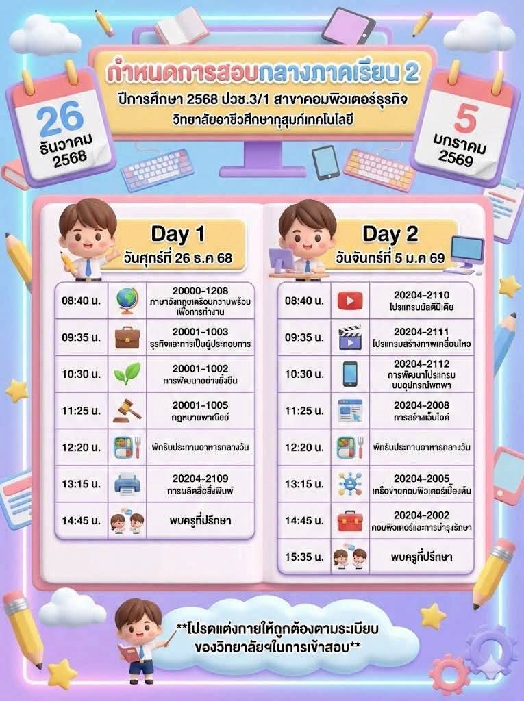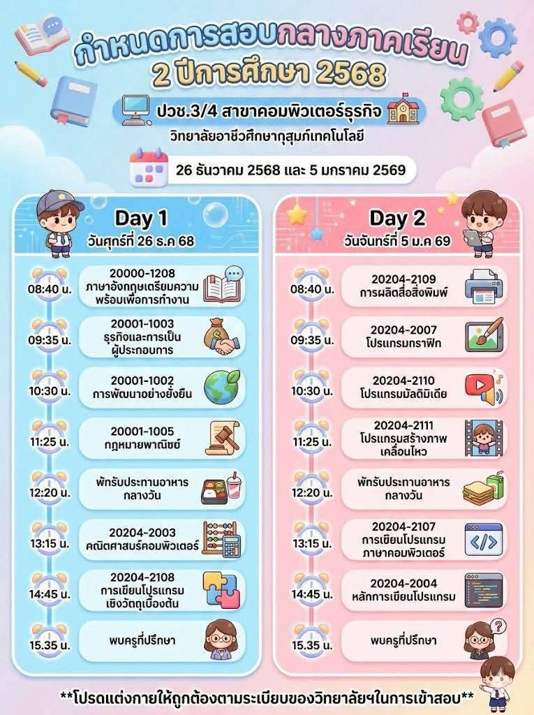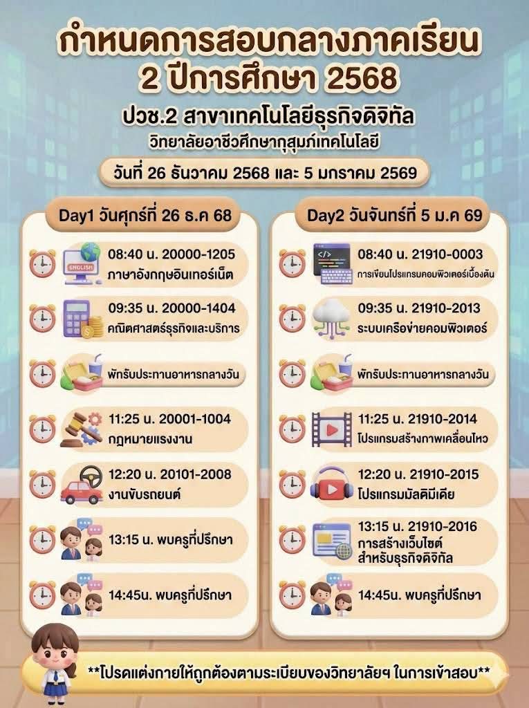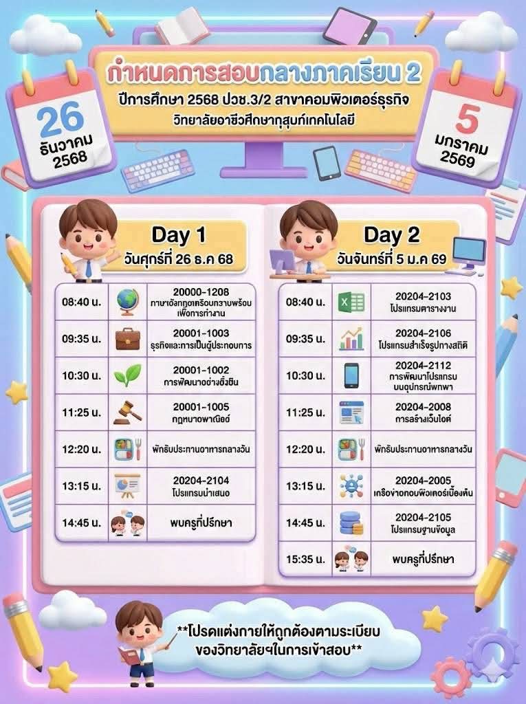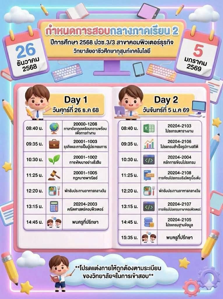 ข่าวประชาสัมพันธ์📍กำหนดตารางสอบกลางภาค ภาคเรียนที่ 2 ปีการศึกษา 2568👉🏻วิทยาลัยขอแจ้งกำหนดการสอบกลางภาค ภาคเรียนที่ 2 ปีการศึกษา 2568 สำหรับนักเรียนและนักศึกษา เพื่อให้ผู้ปกครองและนักเรียนได้เตรียมความพร้อมด้านการเรียนและการจัดตารางเวลาอย่างเหมาะสม โดยกำหนดจัดการสอบในระหว่างวันที่ 26 ธันวาคม 2568 และวันที่ 5 มกราคม 2569จึงขอให้นักเรียนและนักศึกษาทุกระดับชั้นเตรียมความพร้อม👉🏻ตรวจสอบตารางสอบรายวิชาให้เรียบร้อย 👉🏻เตรียมความพร้อมด้านการเรียน อุปกรณ์ 👉🏻ปฏิบัติตามระเบียบการสอบของสถานศึกษาอย่างเคร่งครัด ✨ทั้งนี้ ผู้ปกครองสามารถติดตามรายละเอียดเพิ่มเติมจากประกาศของวิทยาลัยต่อไป