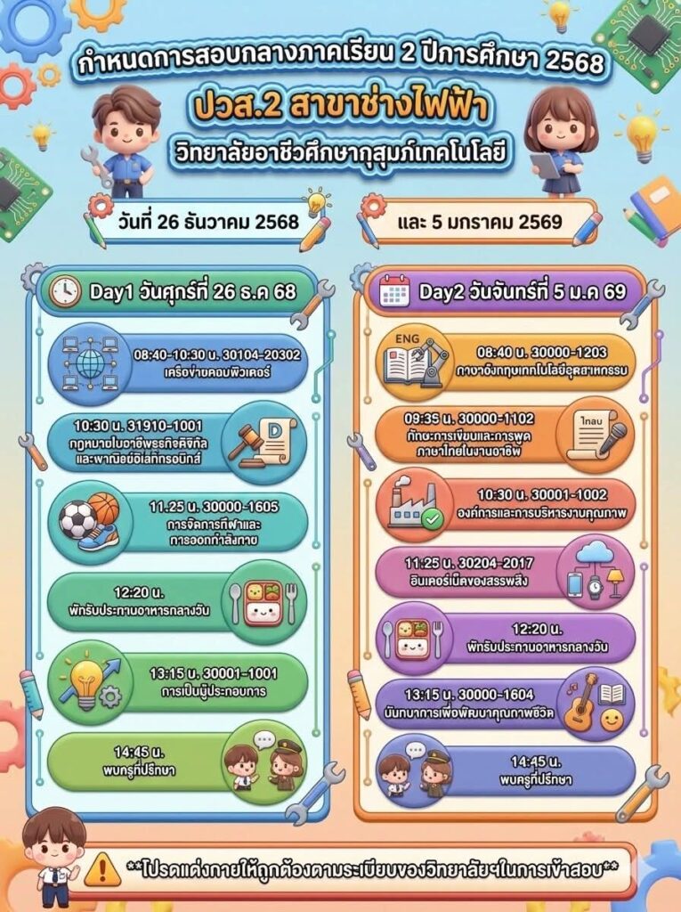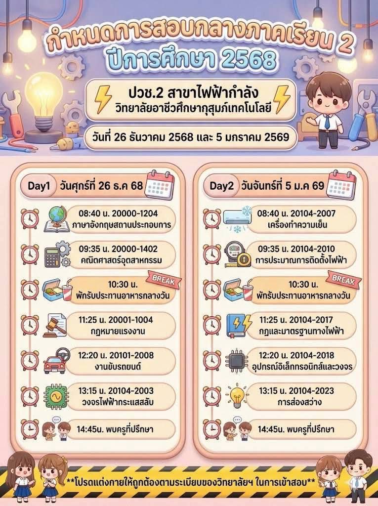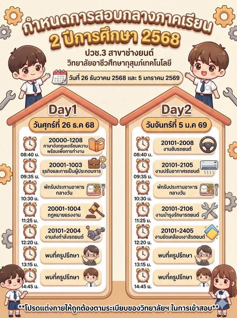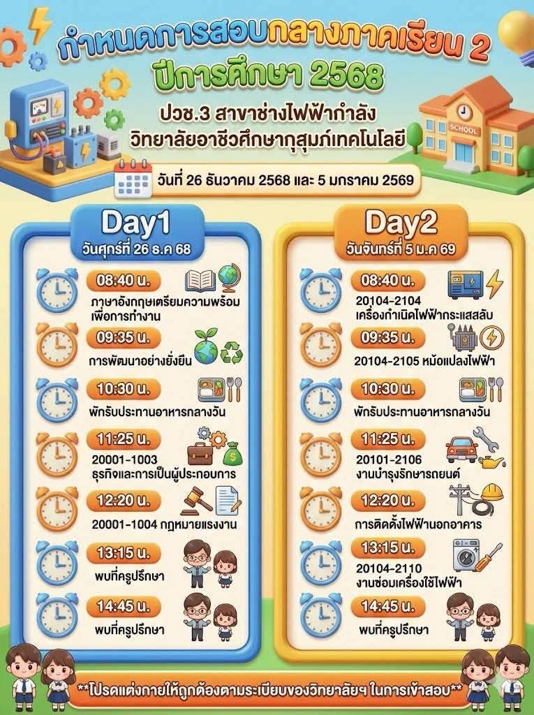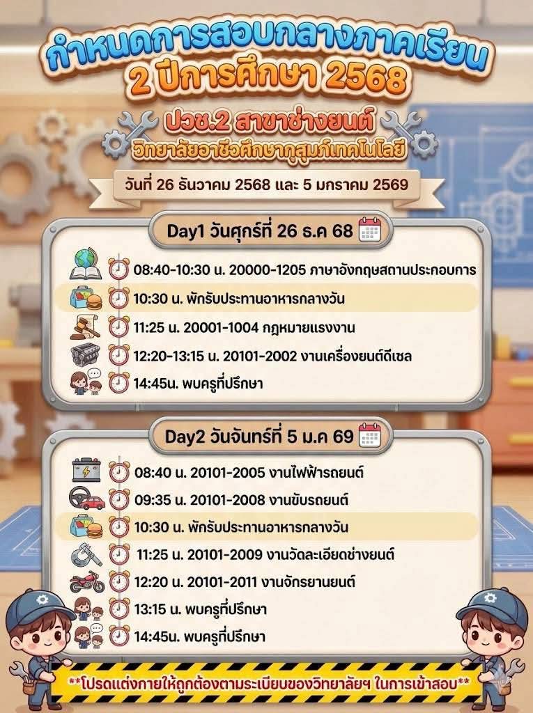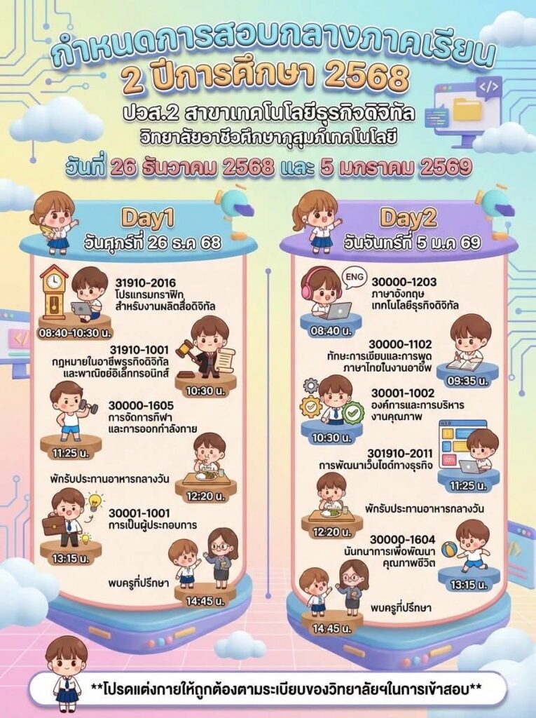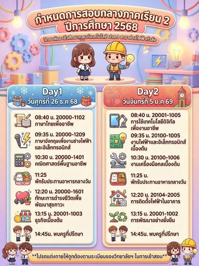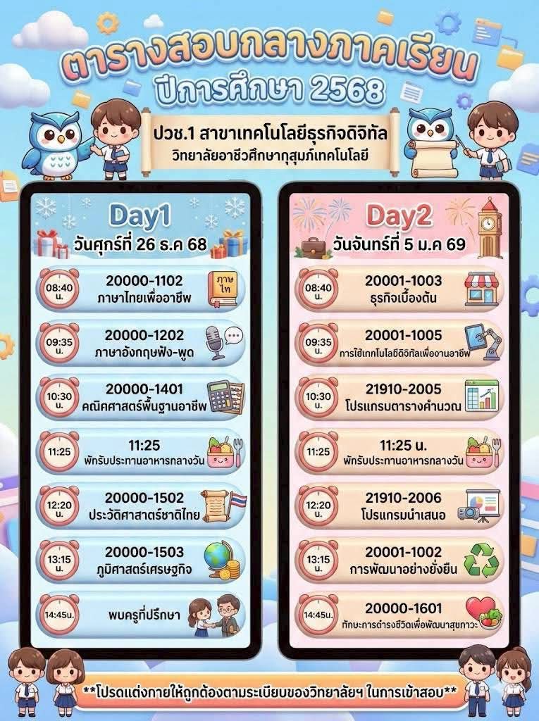 ข่าวประชาสัมพันธ์📍กำหนดตารางสอบกลางภาค ภาคเรียนที่ 2 ปีการศึกษา 2568👉🏻วิทยาลัยขอแจ้งกำหนดการสอบกลางภาค ภาคเรียนที่ 2 ปีการศึกษา 2568 สำหรับนักเรียนและนักศึกษา เพื่อให้ผู้ปกครองและนักเรียนได้เตรียมความพร้อมด้านการเรียนและการจัดตารางเวลาอย่างเหมาะสม โดยกำหนดจัดการสอบในระหว่างวันที่ 26 ธันวาคม 2568 และวันที่ 5 มกราคม 2569จึงขอให้นักเรียนและนักศึกษาทุกระดับชั้นเตรียมความพร้อม👉🏻ตรวจสอบตารางสอบรายวิชาให้เรียบร้อย 👉🏻เตรียมความพร้อมด้านการเรียน อุปกรณ์ 👉🏻ปฏิบัติตามระเบียบการสอบของสถานศึกษาอย่างเคร่งครัด ✨ทั้งนี้ ผู้ปกครองสามารถติดตามรายละเอียดเพิ่มเติมจากประกาศของวิทยาลัยต่อไป